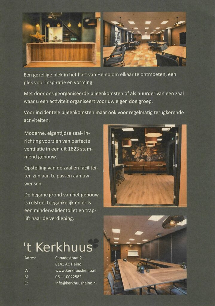 ’t Kerkhuus is de ontmoetings – en vergaderlocatie van de Protestantse Gemeente Heino. Kijk voor meer informatie over onze gemeente op www.protestantsegemeenteheino.nl